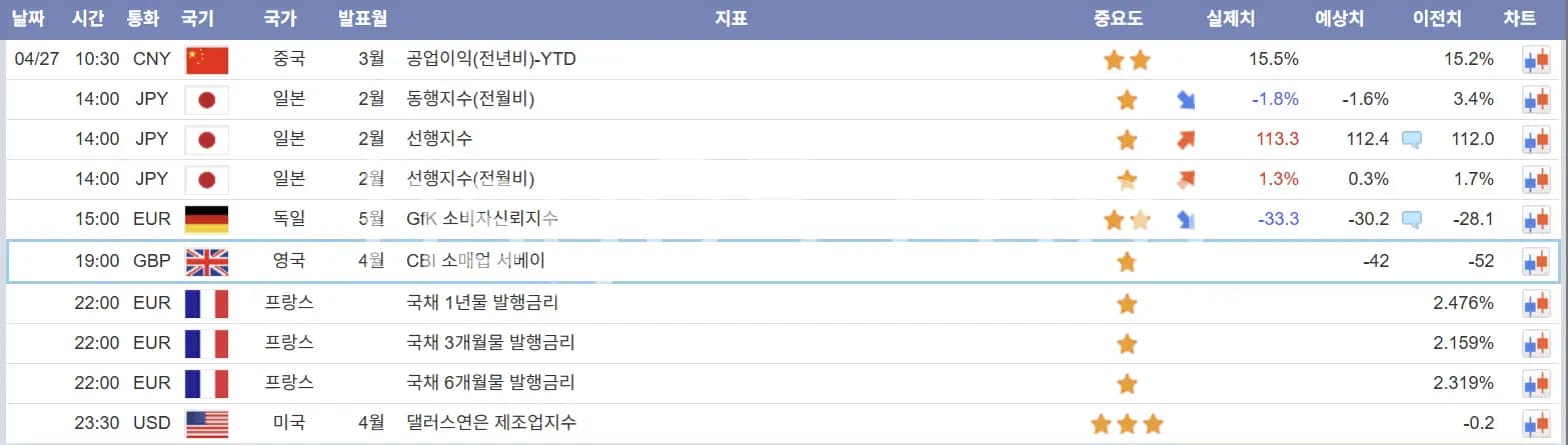 4월27일 해외선물 경제지표 발표일정입니다. -해선길잡이