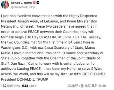 4월17일 해외선물 이스라엘-레바논 휴전 관련 트럼프소셜 뉴스입니다. -해선길잡이(뉴욕=연합인포맥스) = 도널드 트럼프 미국 대통령은 16일(현지시간) 이스라엘과 레바논 정상과 전...