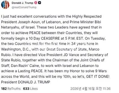 (뉴욕=연합인포맥스) = 도널드 트럼프 미국 대통령은 16일(현지시간) 이스라엘과 레바논 정상과 전화 통화했다면서 "두 지도자는 양국 간 평화를 달성하기 위해, 미 동부시간으로 오후 5시에 10일간의 휴전을 공식적으로 시작하기로 합의했다"고 밝혔다.