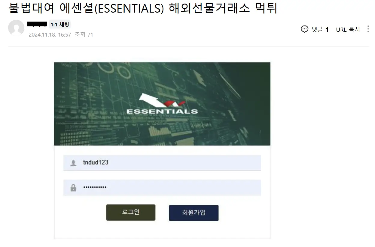 [먹튀 확정] 해외선물 ‘에센셜’ 대여계좌 먹튀 확정! 즉시 이용 중단하세요.