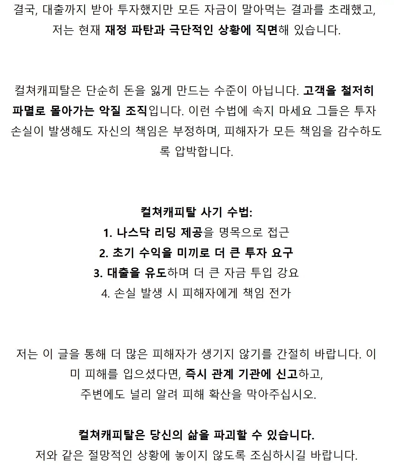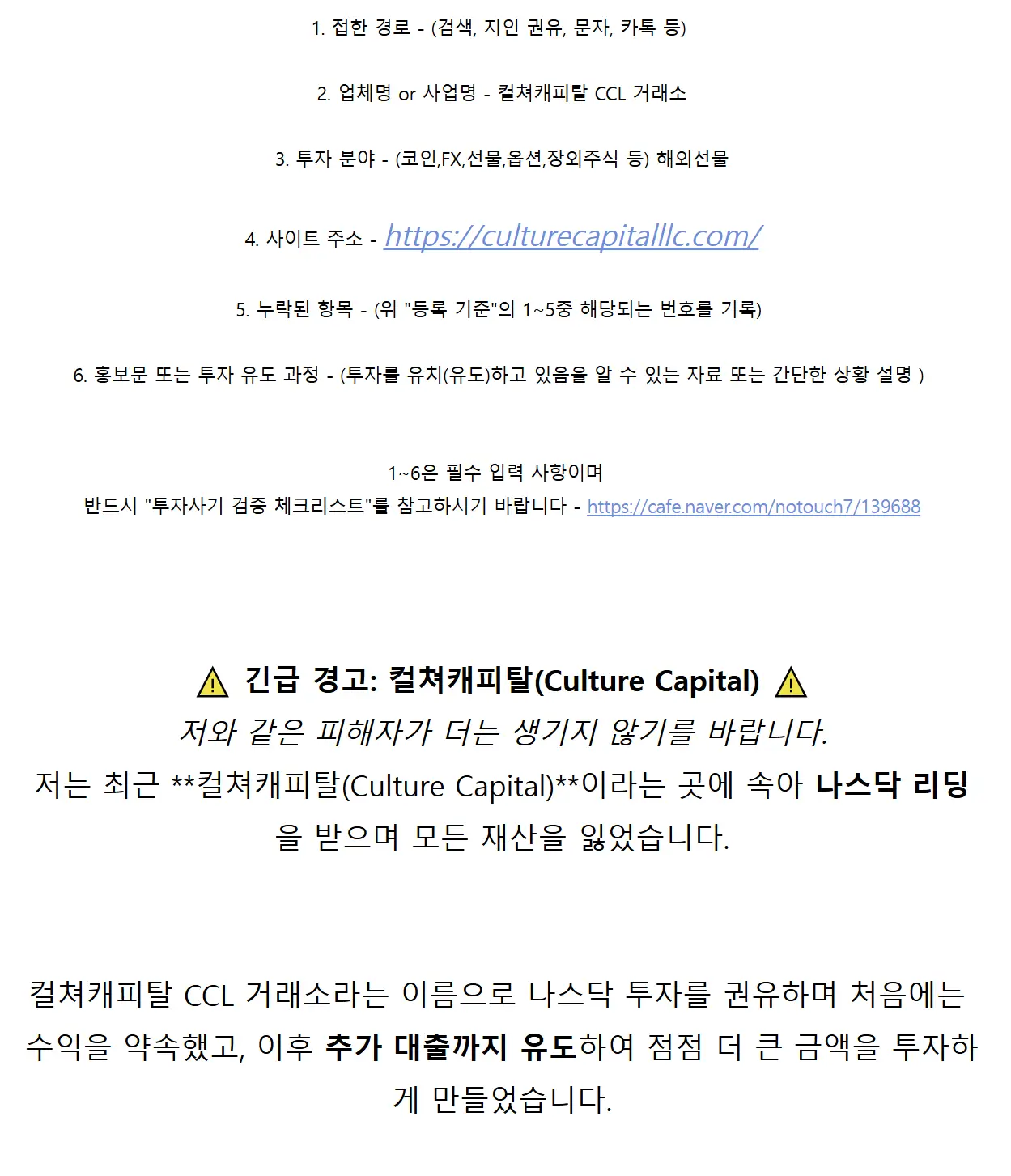 ‘컬쳐캐피탈’을 이용 중인 분들은 추가 피해를 입지 않도록 지금 바로 이용을 중단하시길 바랍니다.